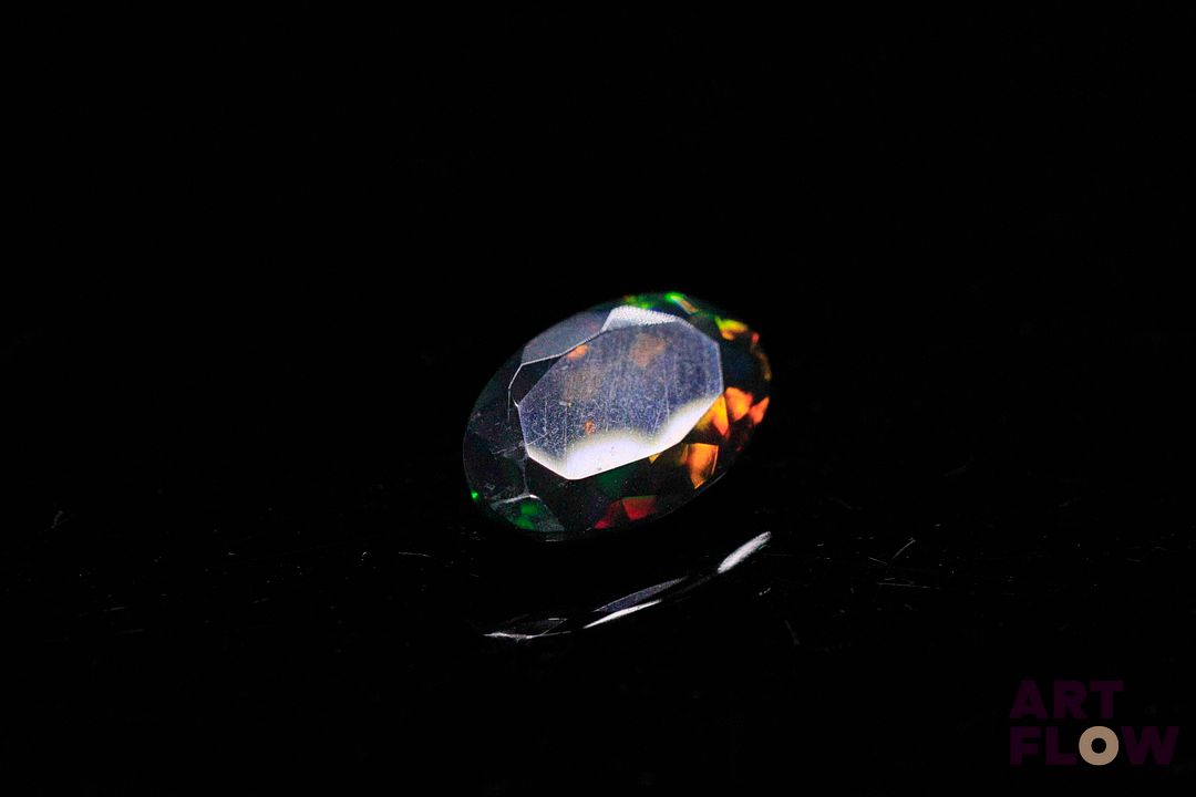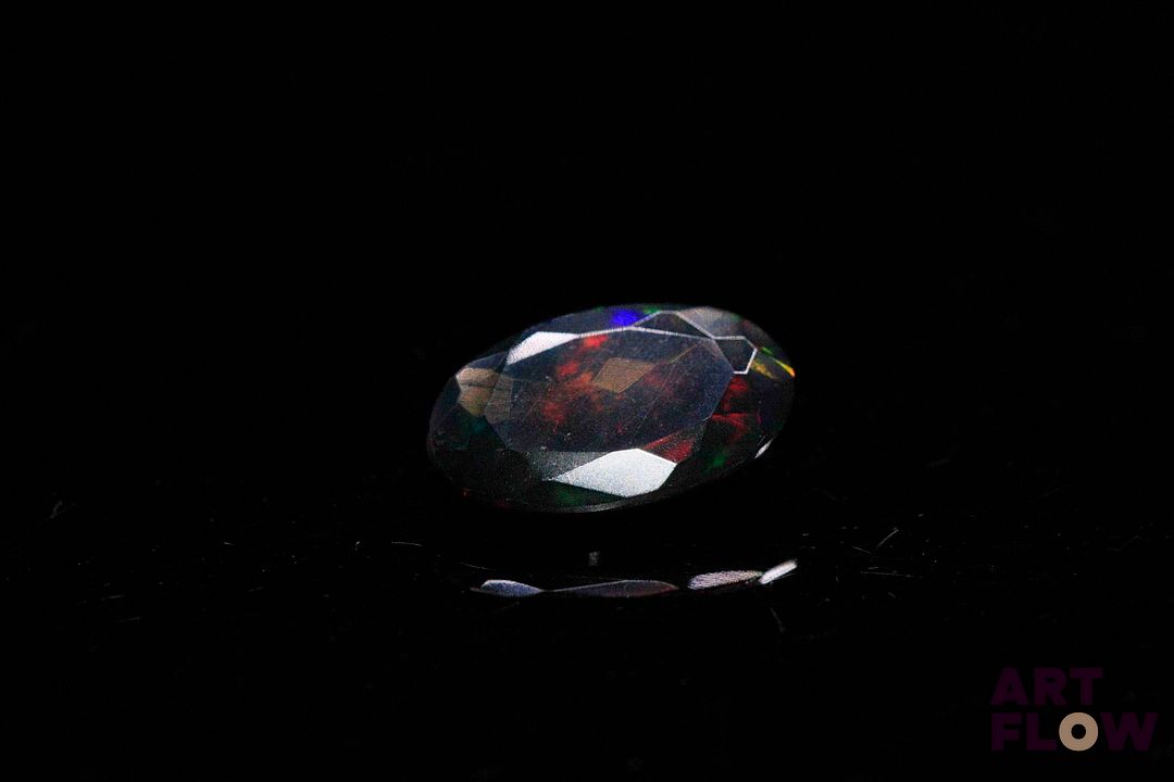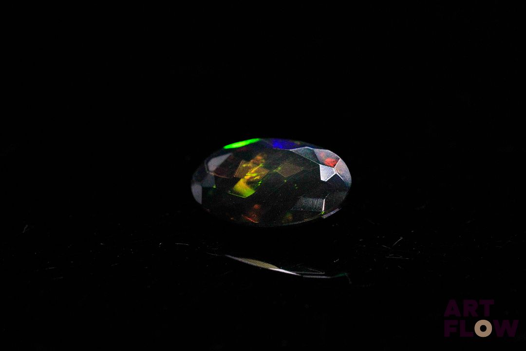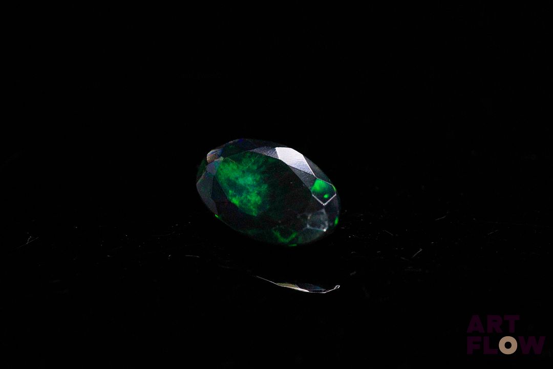 Opale facettée noire ovale. Beaux éclats de couleur, dominante verte. Probablement traitée. 2.00 cts. 13.2mm x 8.0mm