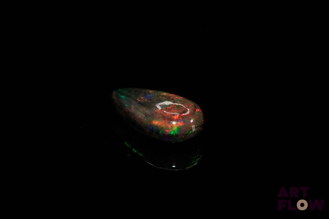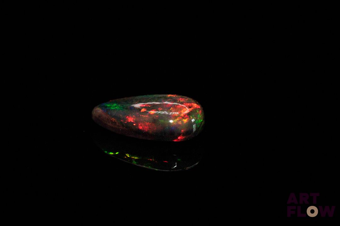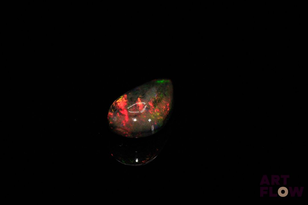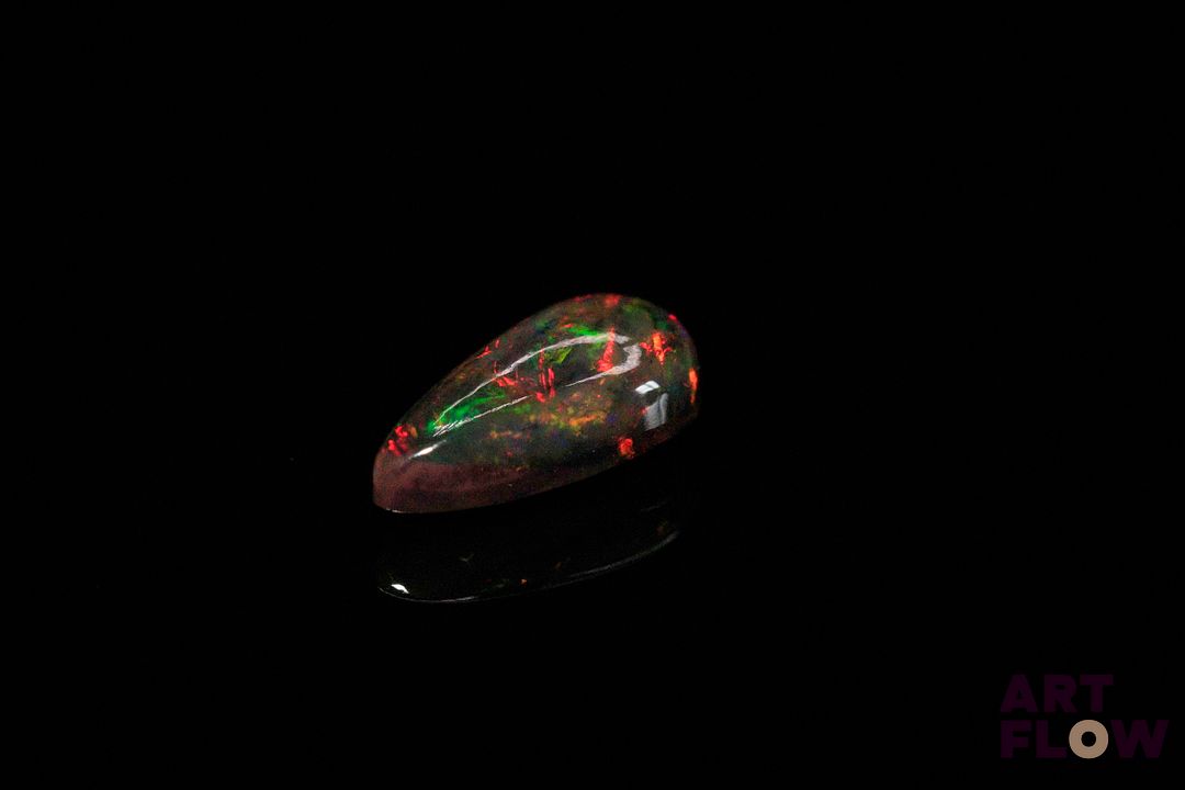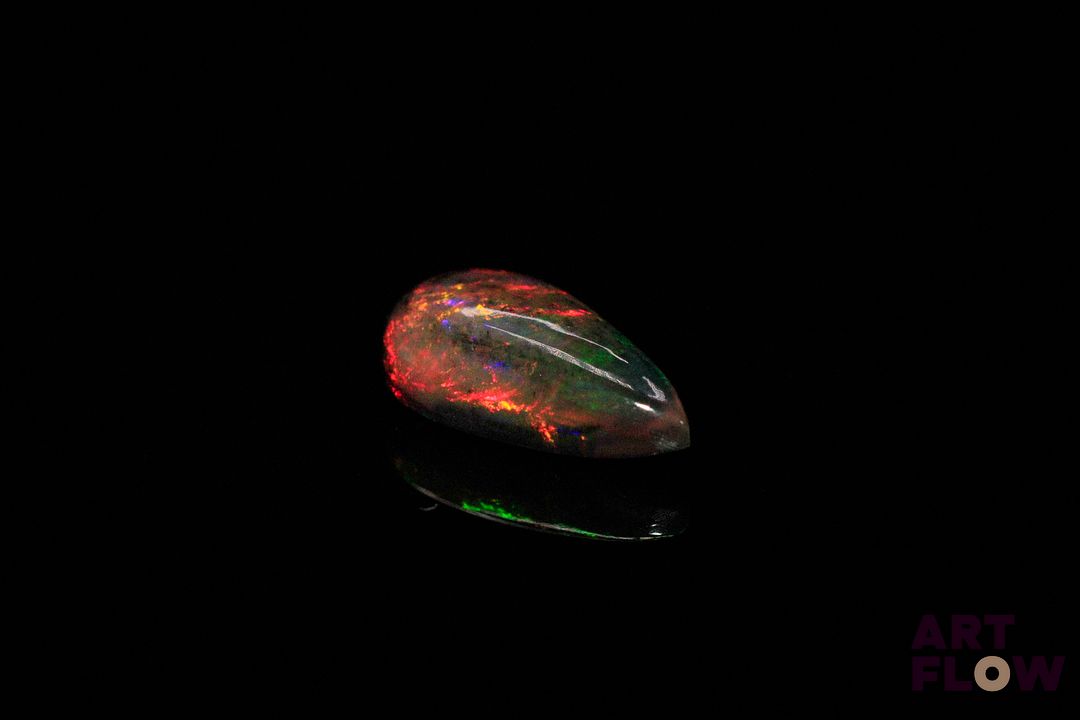 Opale noire cabochon poire. Beaux éclats de couleur, dominante rouge. 2.70 cts. 14.0mm x 7.5mm