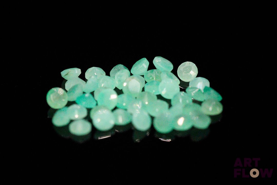 Quarante-deux émeraudes rondes. Probablement Brésil, non chauffée. 4.96 cts. Diam. moy.: 3.0mm