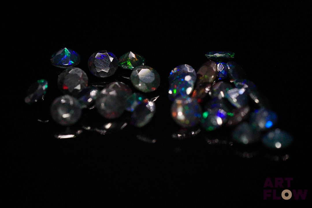Trente opales noires rondes. Beaux éclats de couleur. 4.08 cts. Diam. moy.: 4.0mm