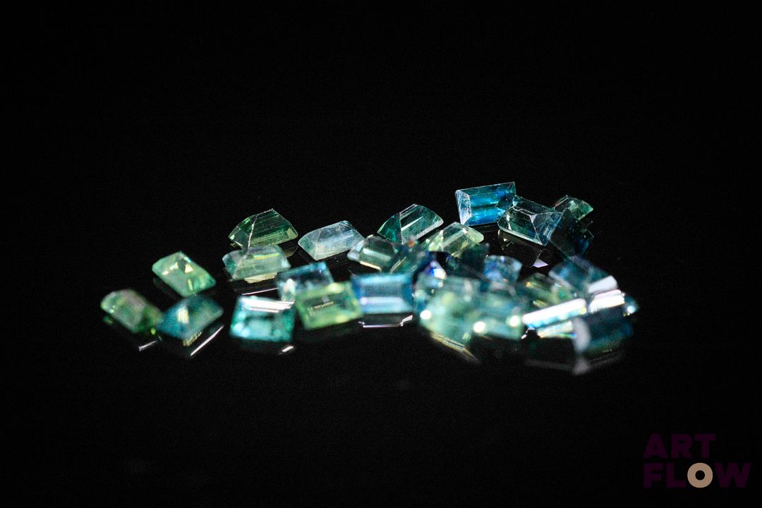 Trente saphirs bleus verts rectangulaires à pans vifs. 3.04 cts. Dims. moy.: 3.0mm x 2.0mm