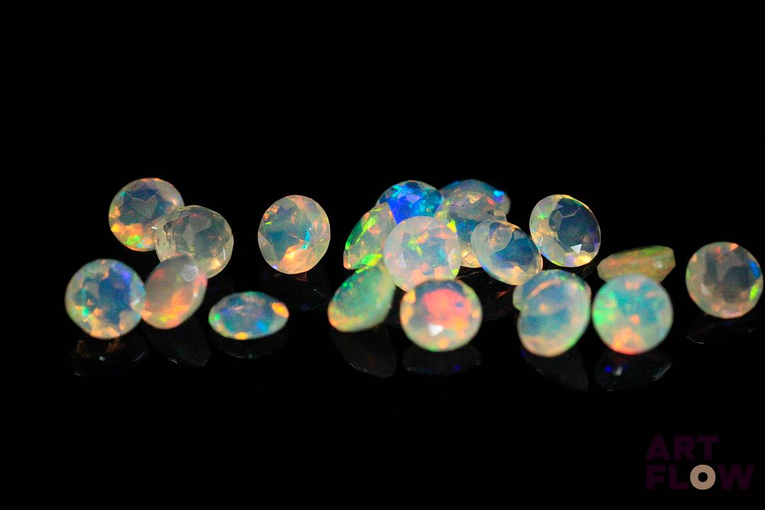 Vingt opales facettées blanches rondes. Beaux éclats de couleur. 3.32 cts. Diam. moy.: 4.1mm