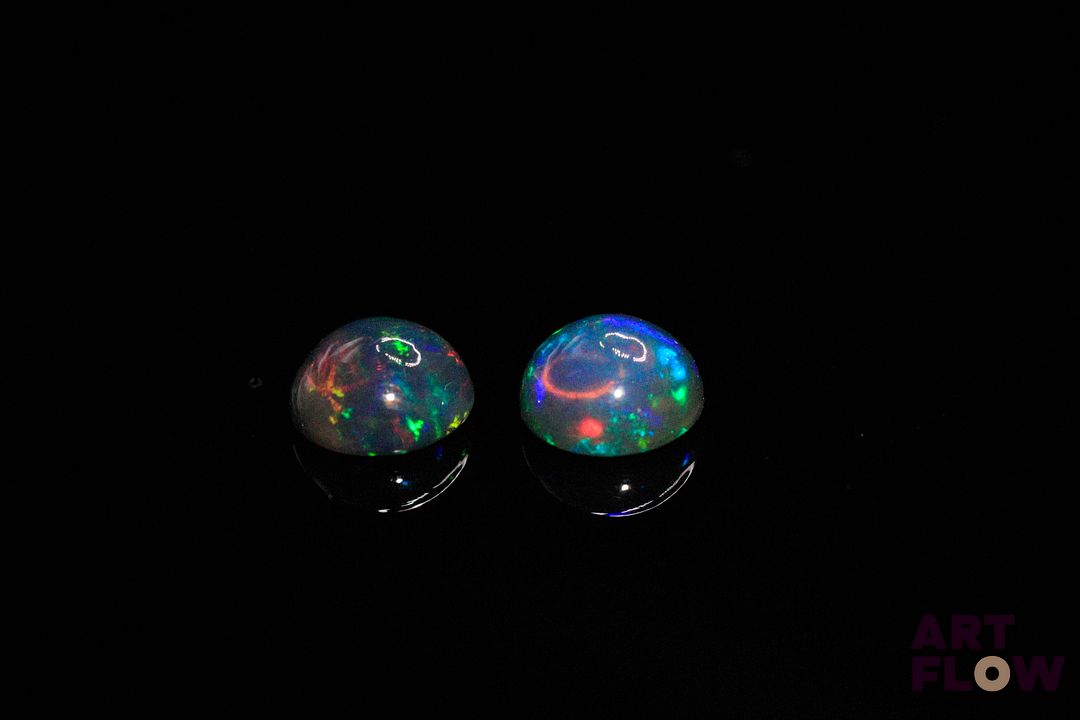 Appairage d’opales noires cabochons ronds. Beaux éclats de couleur. 2.50 cts. Diam. moy.: 7.0mm