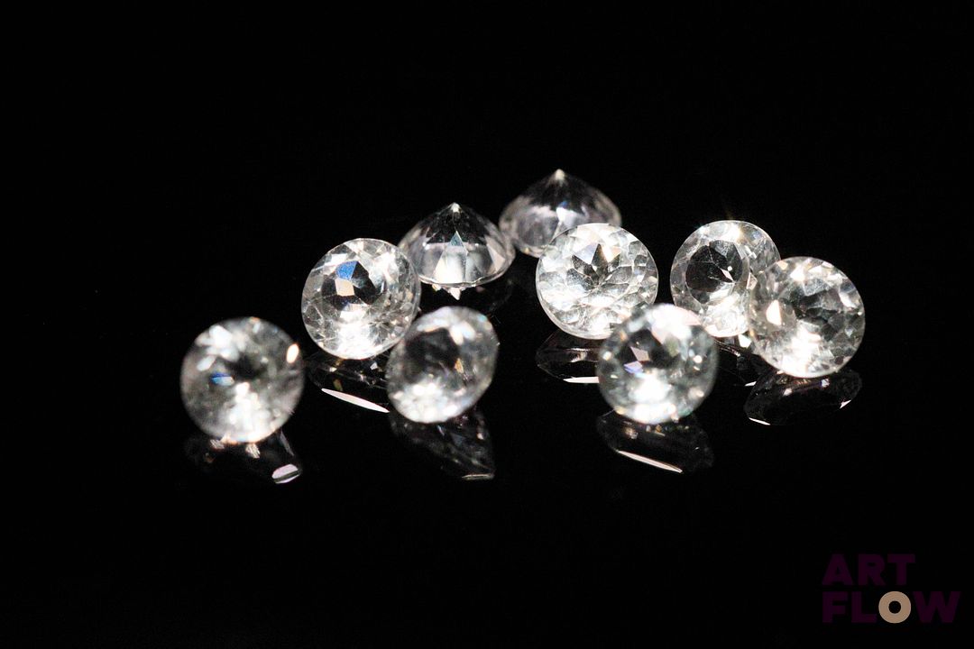 Neuf topazes incolores rondes. 5.25 cts. Diam. moy.: 5.0mm