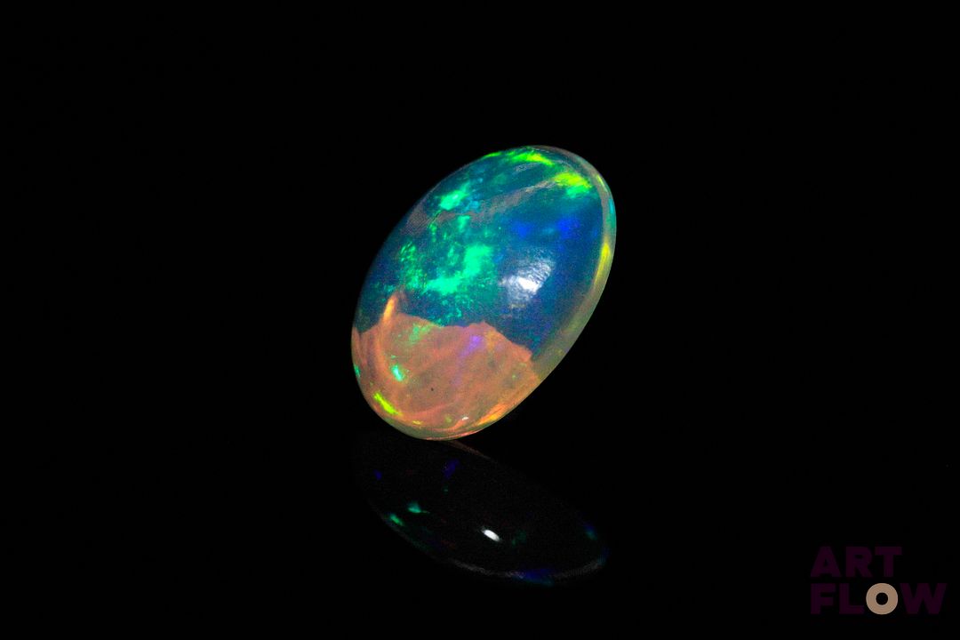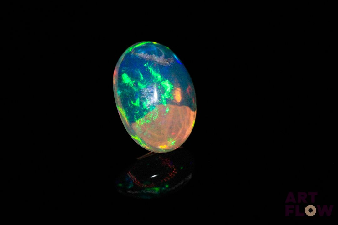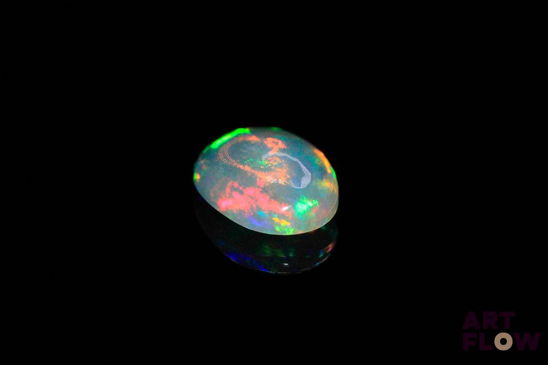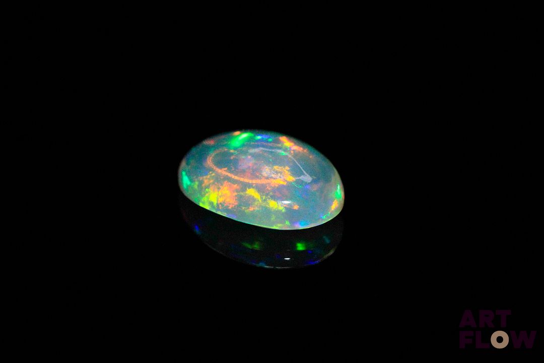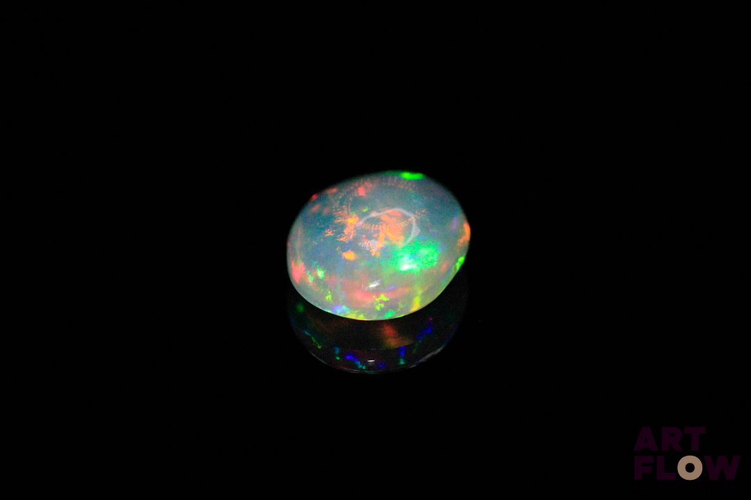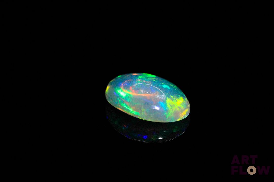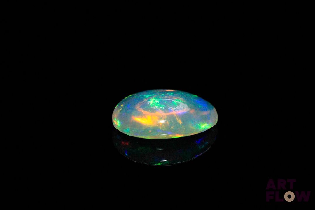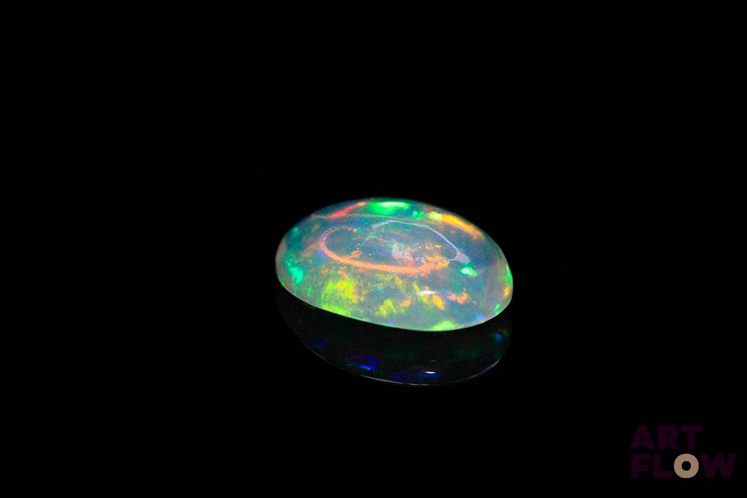 Opale blanche cabochon ovale. Beaux éclats de couleur, dominante verte. 3.40 cts. 14.0mm x 10.0mm