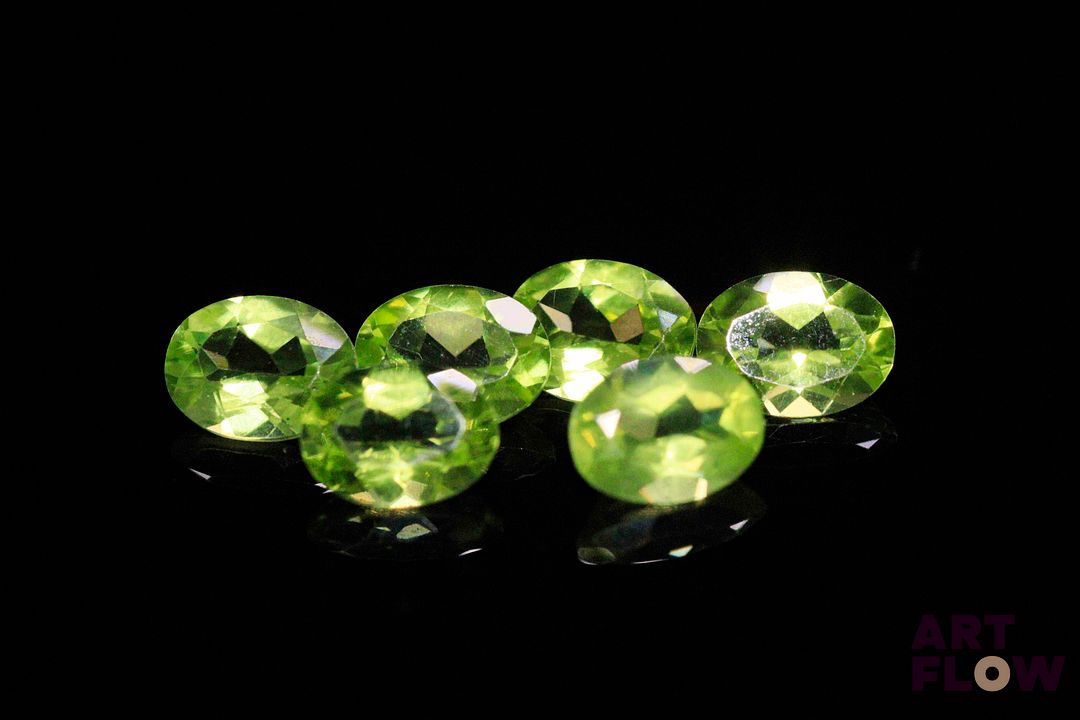 Six péridots ovales. 7.60 cts. Dims. moy.: 8.0mm x 6.0mm