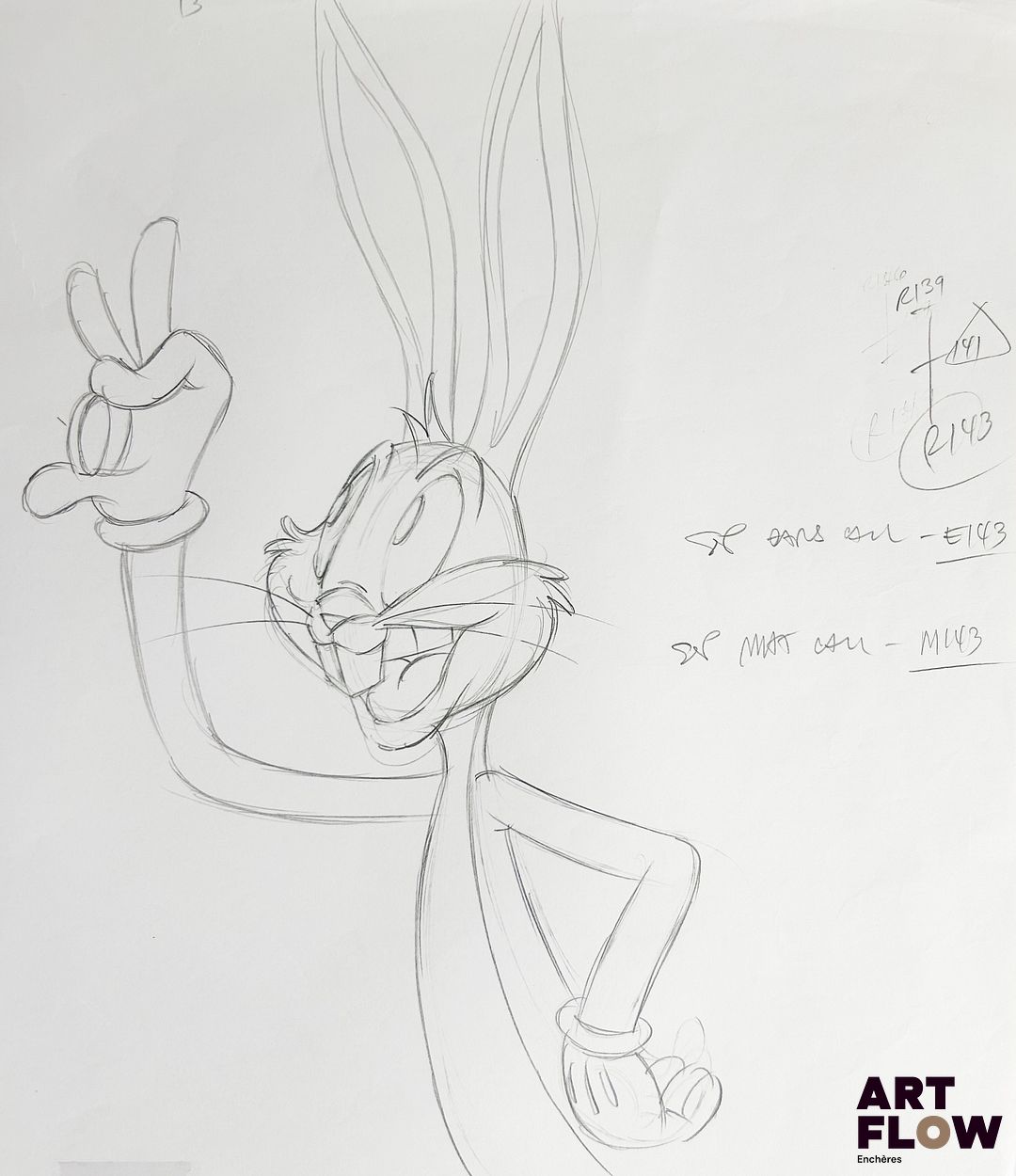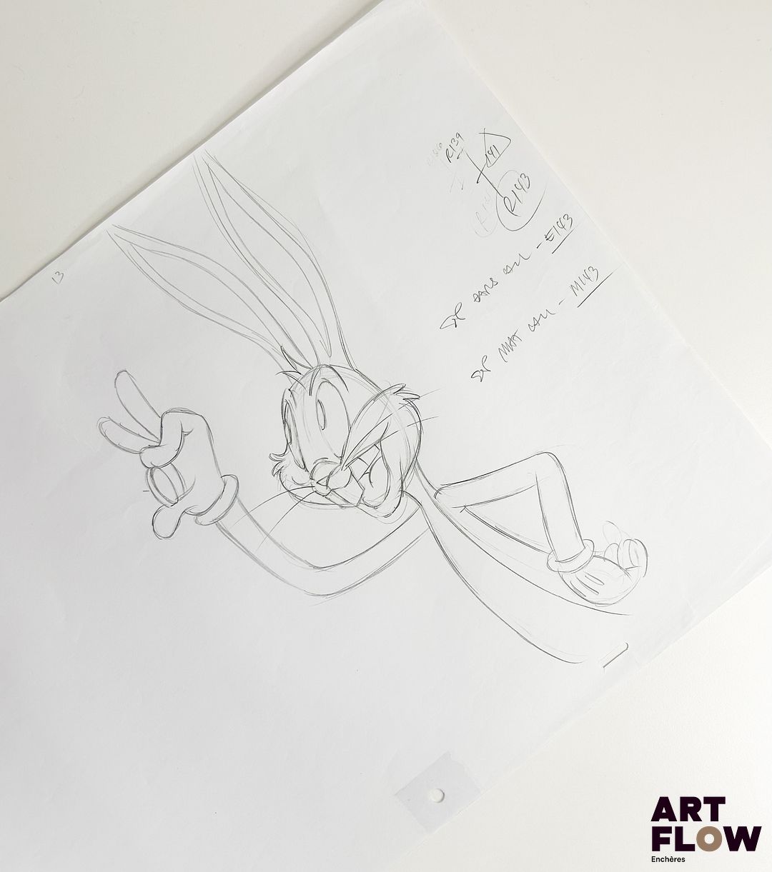 D’après Tex Avery Bugs Bunny Dessin original à la mine de plomb représentant Bugs Bunny regardant une bague Animé américain issu de l’univers Looney Tunes, créé par les studios Warner Bros. « Bugs Bunny est un lapin espiègle et intelligent qui, grâce à son humour et à son sang-froid, déjoue sans cesse les plans de ses adversaires dans des aventures devenues cultes de l’animation. » Dimensions : 30,5 x 43 cm