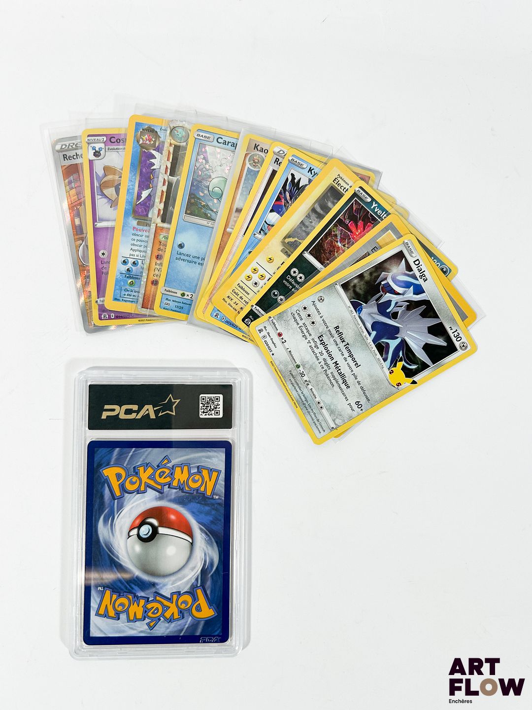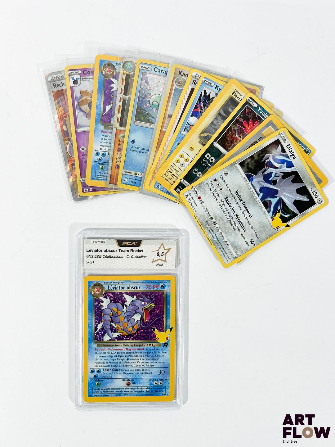 Ensemble de 13 cartes Pokémon – Collection 25 ans Célébrations. Contient notamment le Léviator Obscur 8/82 holographique PCA 9,5 (Neuf). Cartes en état Near-Mint / Mint, en français.