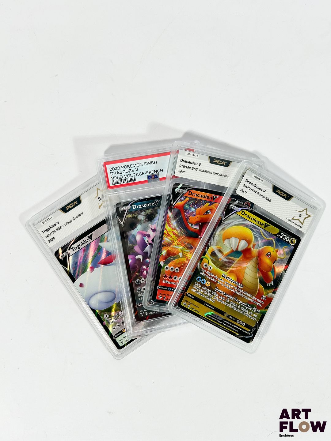 Ensemble de 4 cartes Pokémon gradées du bloc de série Épée&Bouclier : – Dracaufeu V 019/189 – Ténèbres Embrasées – PCA 9,5 (Neuf). – Dracolosse V SWSH154 – Promotionelle – PCA 9 (Proche du Neuf). – Togekiss V 140/185 – Voltage Éclatant – PCA 9,5 (Neuf). – Drascore V 160/185 – Voltage Éclatant – PSA 9 (Neuf). Cartes en français.