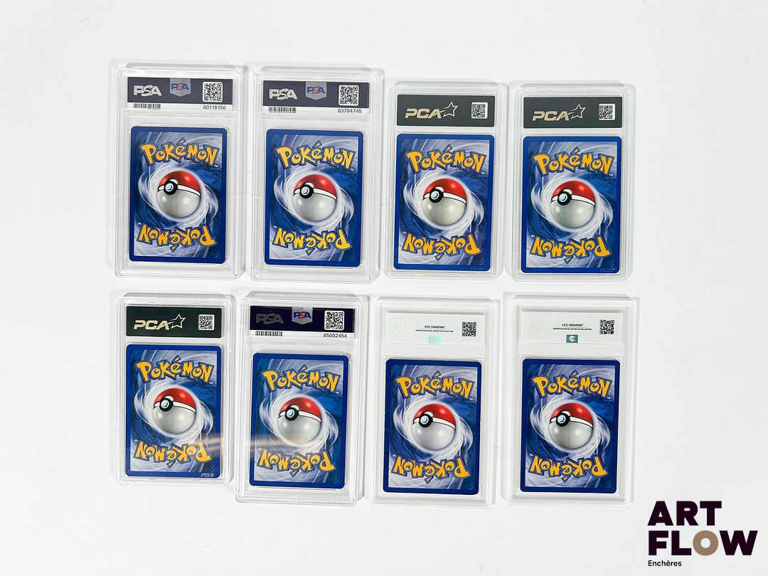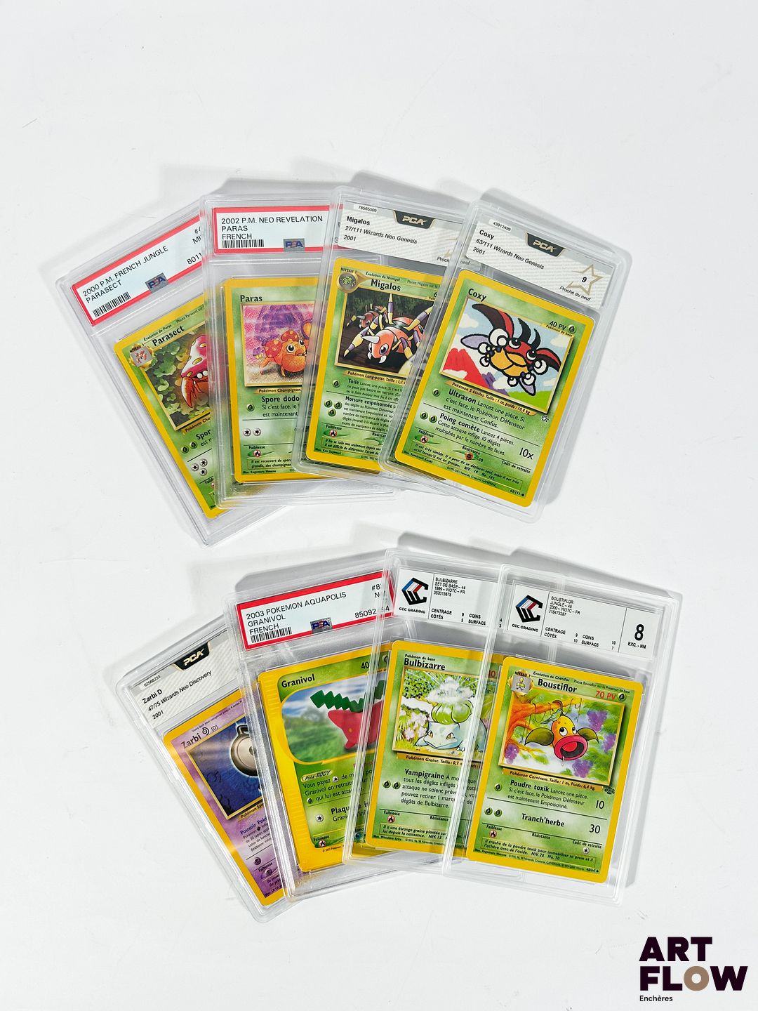 Ensemble de 8 cartes Pokémon gradées du bloc Wizards communes et peu communes : – Granivol 83/147 – Aquapolis – PSA 7 (Proche du Neuf). – Zarbi D 47/75 – Neo Discovery – PCA 9 (Proche du Neuf). – Migalos 27/111 – Neo Genesis – PCA 9 (Proche du Neuf). – Coxy 63/111 – Neo Genesis – PCA 9 (Proche du Neuf). – Paras 47/64 – Neo Révélation – PSA 8 (Proche du Neuf / Neuf). – Parasect 41/64 – Jungle – PSA 9 (Neuf). – Boustiflor 48/64 – Jungle – CCC 8 (Excellent / Proche du Neuf). – Bulbizarre 44/102 – Set de Base – CCC 4 (Correct). En français.
