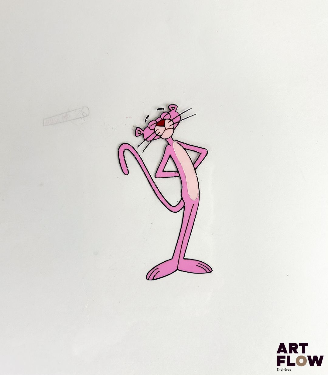 La Panthère Rose (The Pink Panther) Cellulo à l’encre et à la gouache représentant la Panthère Rose les yeux fermés Animé américain d’après la série créée par Friz Freleng et David DePatie « La Panthère Rose est le personnage principal de son univers animé. C’est une panthère anthropomorphe, élégante et malicieuse, connue pour son calme, son humour subtil et ses situations comiques souvent muettes. Elle se distingue par sa capacité à se sortir habilement de situations absurdes tout en conservant son style raffiné et son charme unique. » Dimensions : 27 x 31,5 cm