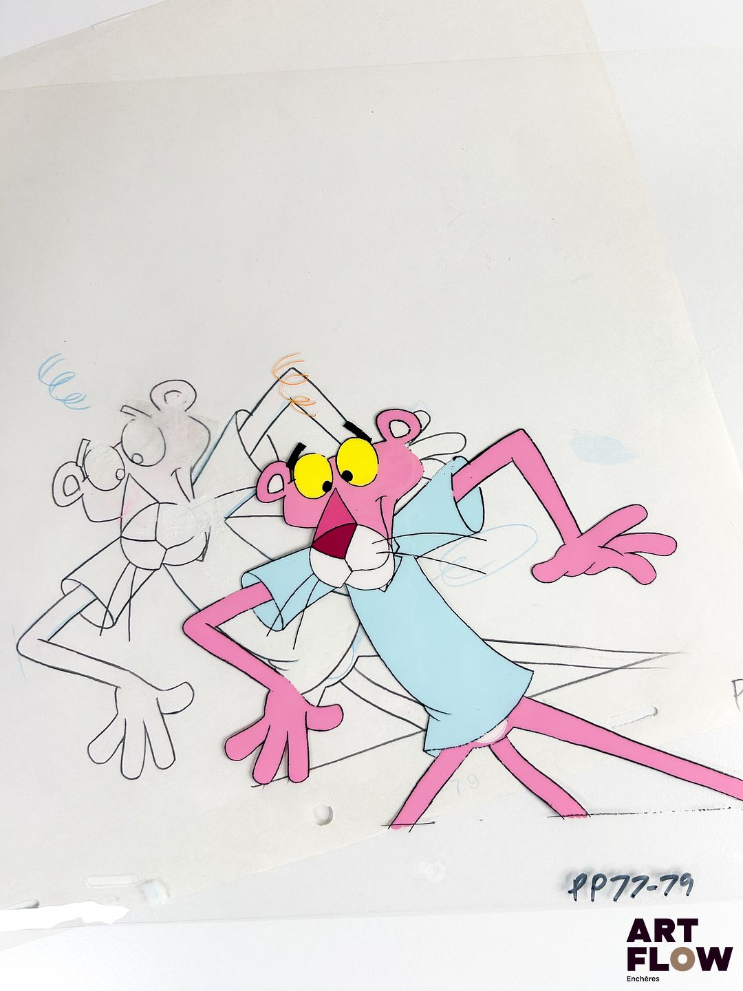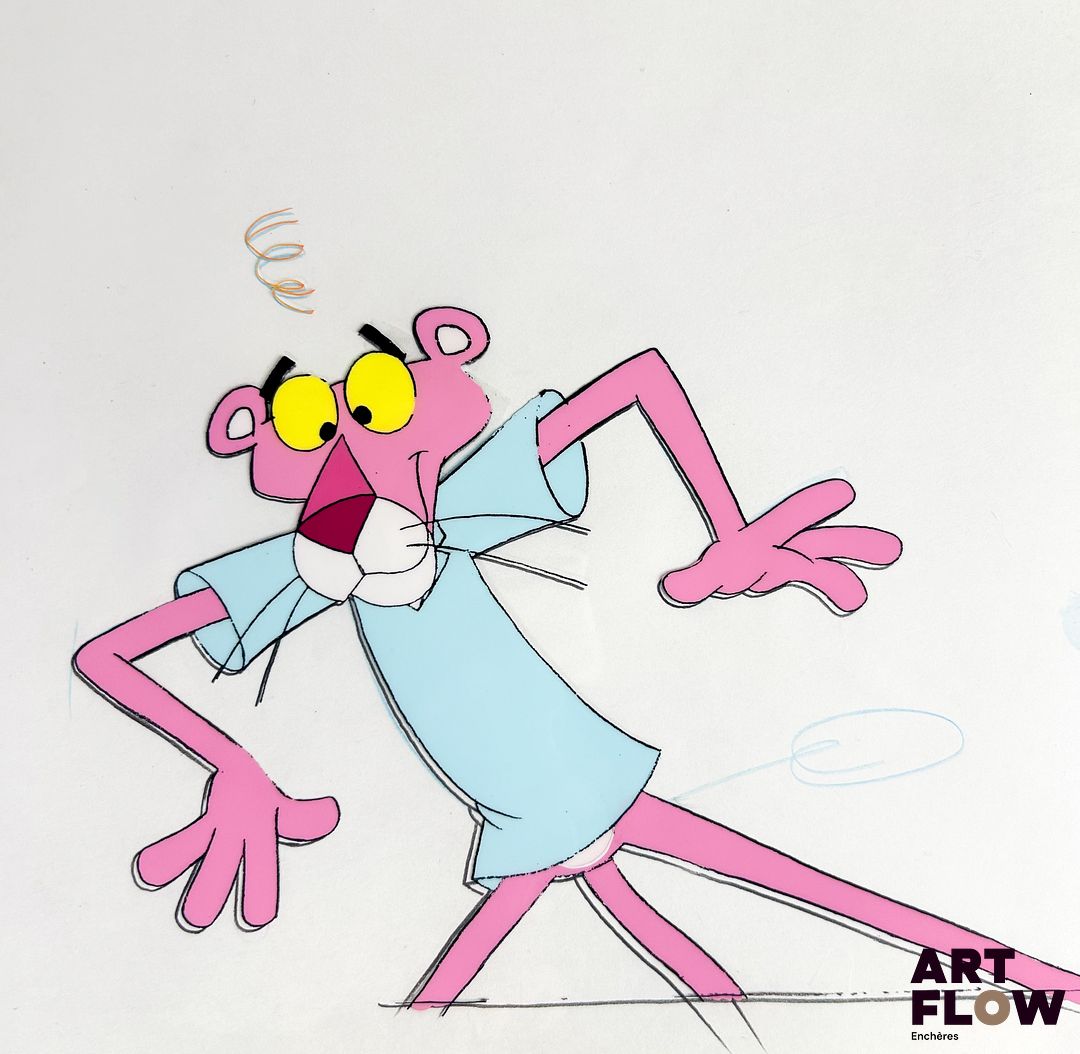 La Panthère Rose (The Pink Panther) d’après Friz Freleng Cellulo à l’encre et à la gouache représentant la Panthère Rose effrayée Animé américain d’après la série créée par Friz Freleng et David DePatie « La Panthère Rose est le personnage principal de son univers animé. C’est une panthère anthropomorphe, élégante et malicieuse, connue pour son calme, son humour subtil et ses situations comiques souvent muettes. Elle se distingue par sa capacité à se sortir habilement de situations absurdes tout en conservant son style raffiné et son charme unique. » Dimensions : 27 x 31,5 cm