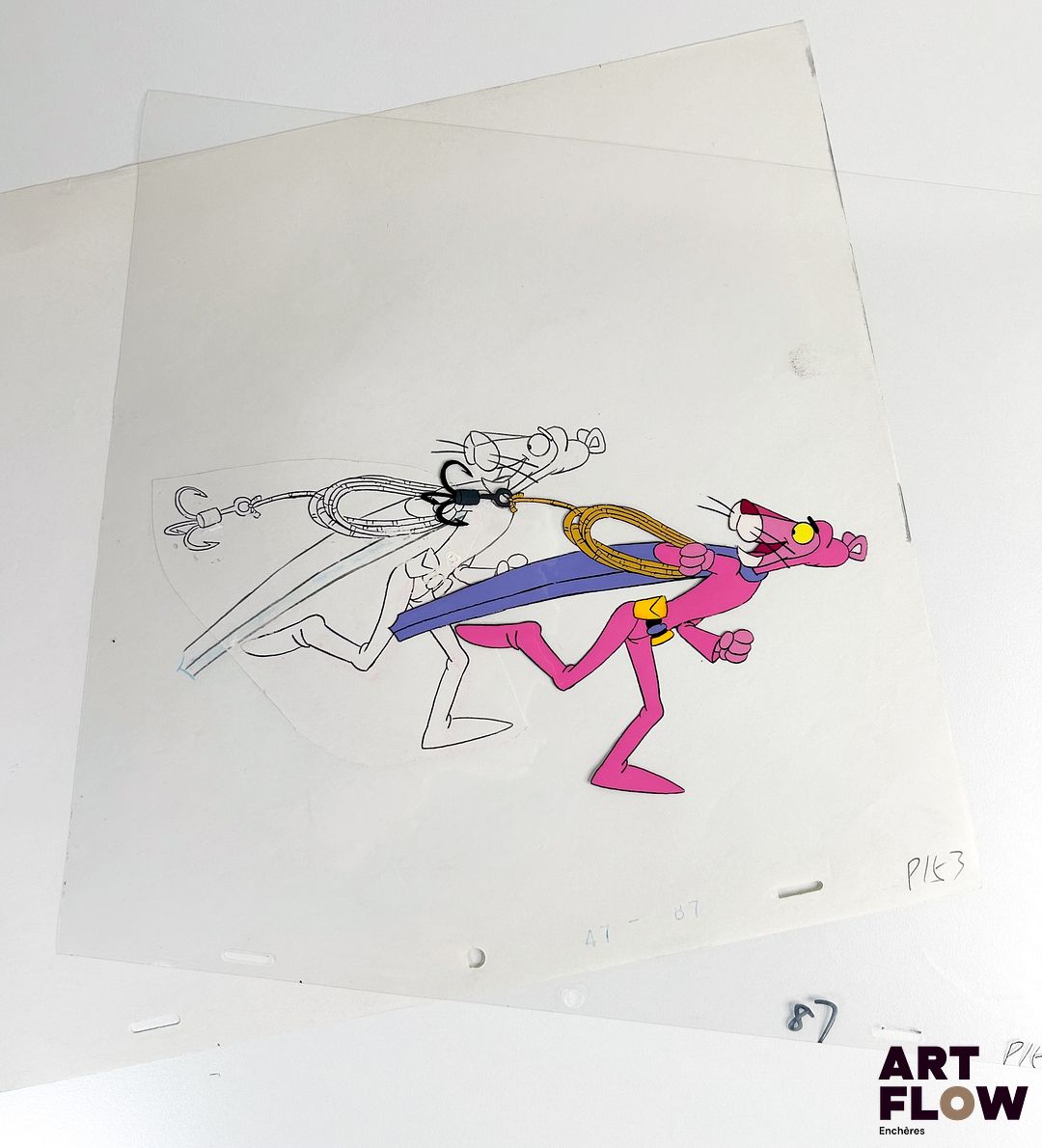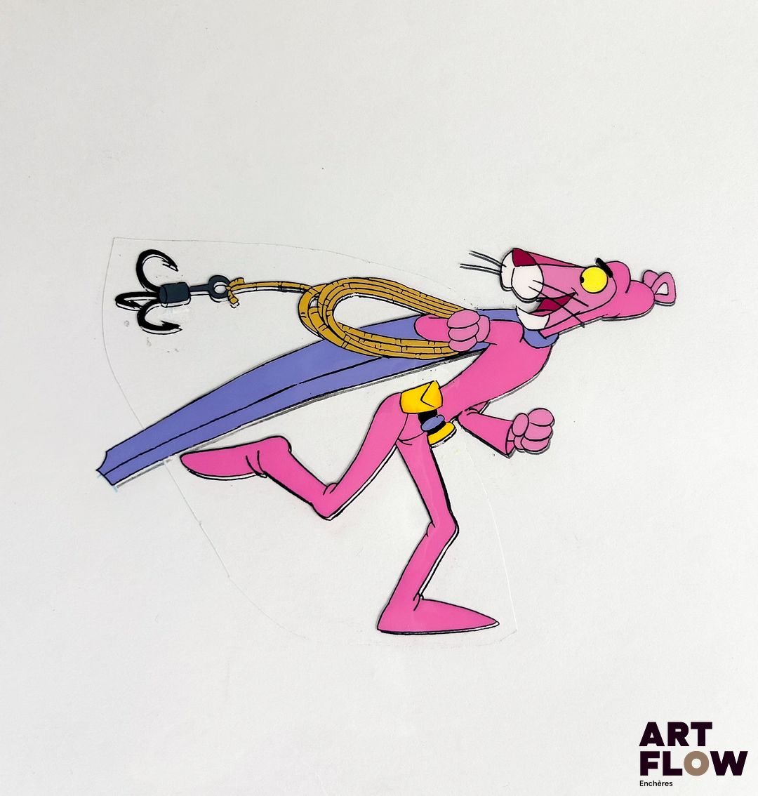 La Panthère Rose (The Pink Panther),d’après Friz Freleng Cellulo à l’encre et à la gouache représentant la Panthère Rose tenant un hameçon Animé américain d’après la série créée par Friz Freleng et David DePatie « La Panthère Rose est le personnage principal de son univers animé. C’est une panthère anthropomorphe, élégante et malicieuse, connue pour son calme, son humour subtil et ses situations comiques souvent muettes. Elle se distingue par sa capacité à se sortir habilement de situations absurdes tout en conservant son style raffiné et son charme unique. » Dimensions : 27 x 31,5 cm