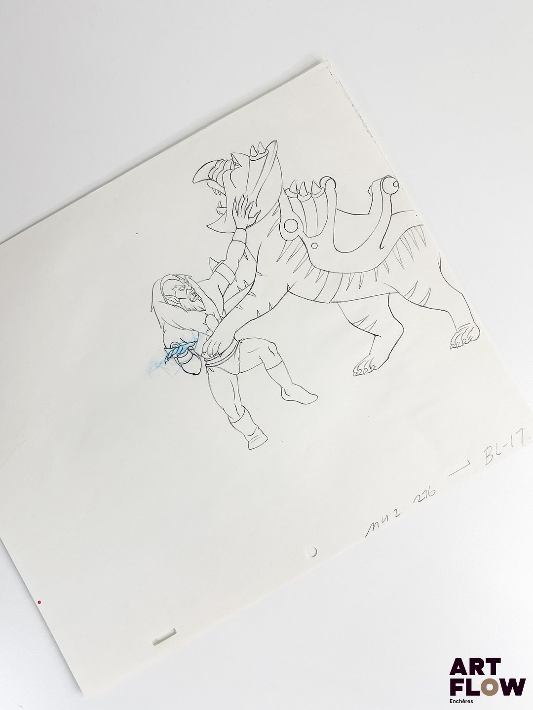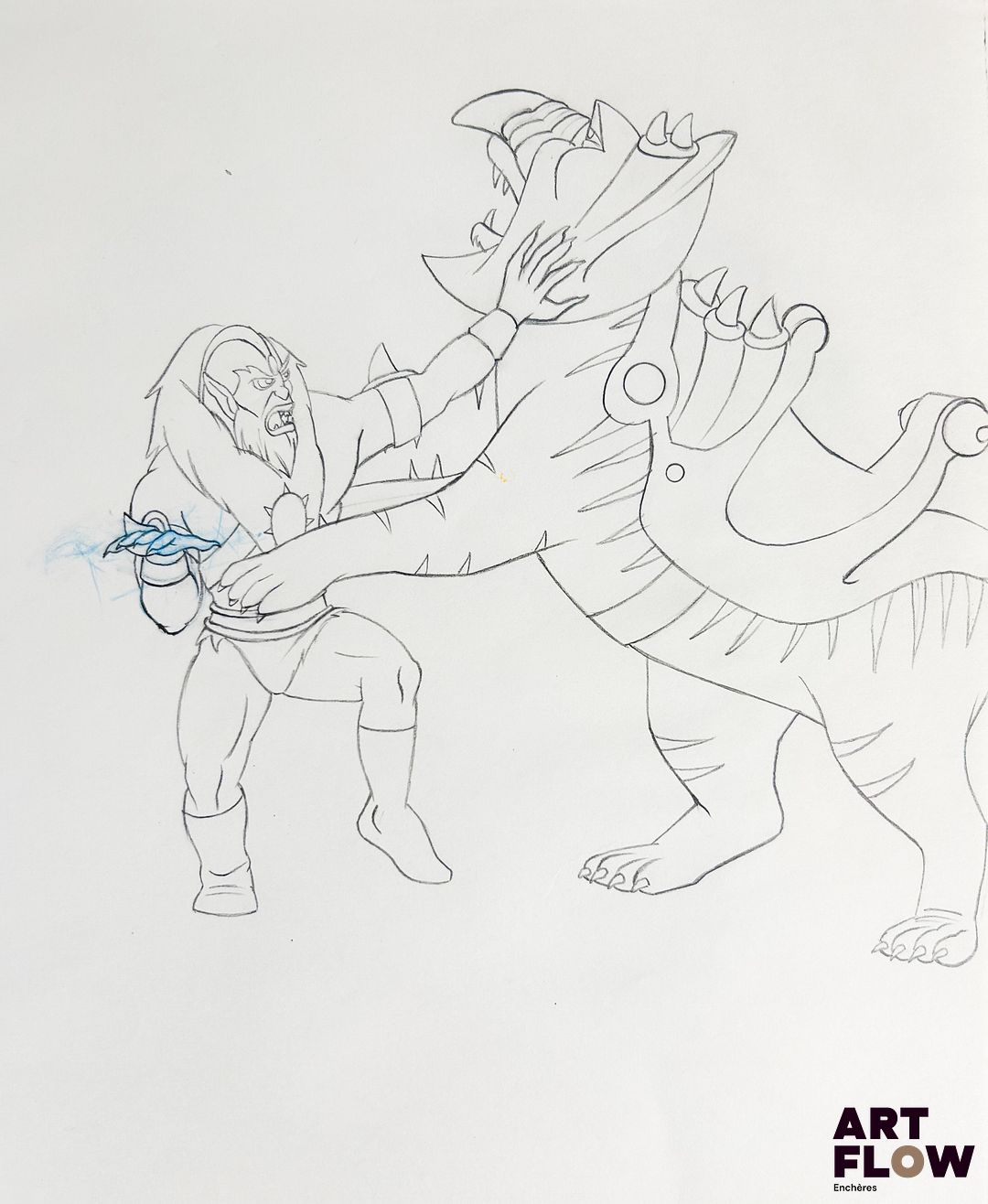 Les Maîtres de l’Univers (He-Man and the Masters of the Universe) D’après les dessins de Lou Scheimer et Hal Sutherland Beast Man Dessin à la mine de plomb et crayon de couleur représentant Beast Man de face. Animé américain d’après la série Les Maîtres de l’Univers (He-Man and the Masters of the Universe), créée par Lou Scheimer, Larry DiTillio et J. Michael Straczynski. « Beast Man est l’un des plus fidèles serviteurs de Skeletor. Homme-bête à la force redoutable, il possède le pouvoir de contrôler les créatures sauvages d’Eternia. Brutal et impulsif, il incarne la sauvagerie au service du mal, tout en demeurant une figure emblématique et reconnaissable de l’univers des Maîtres de l’Univers. » Dimensions : 27 x 31,5 cm