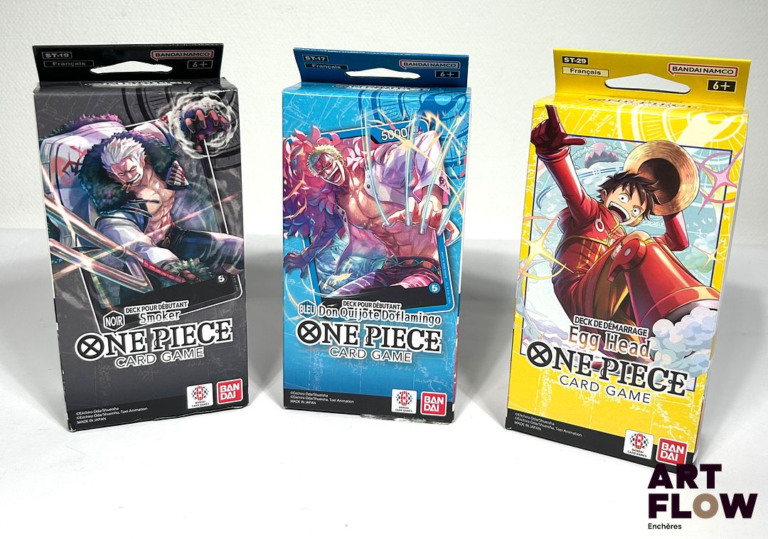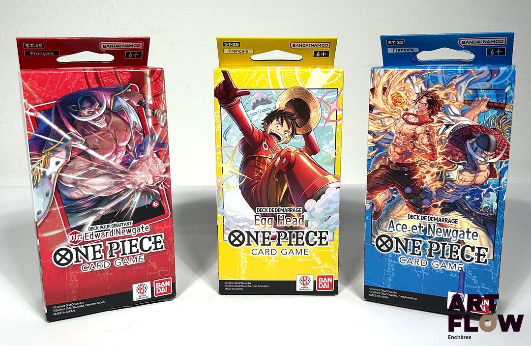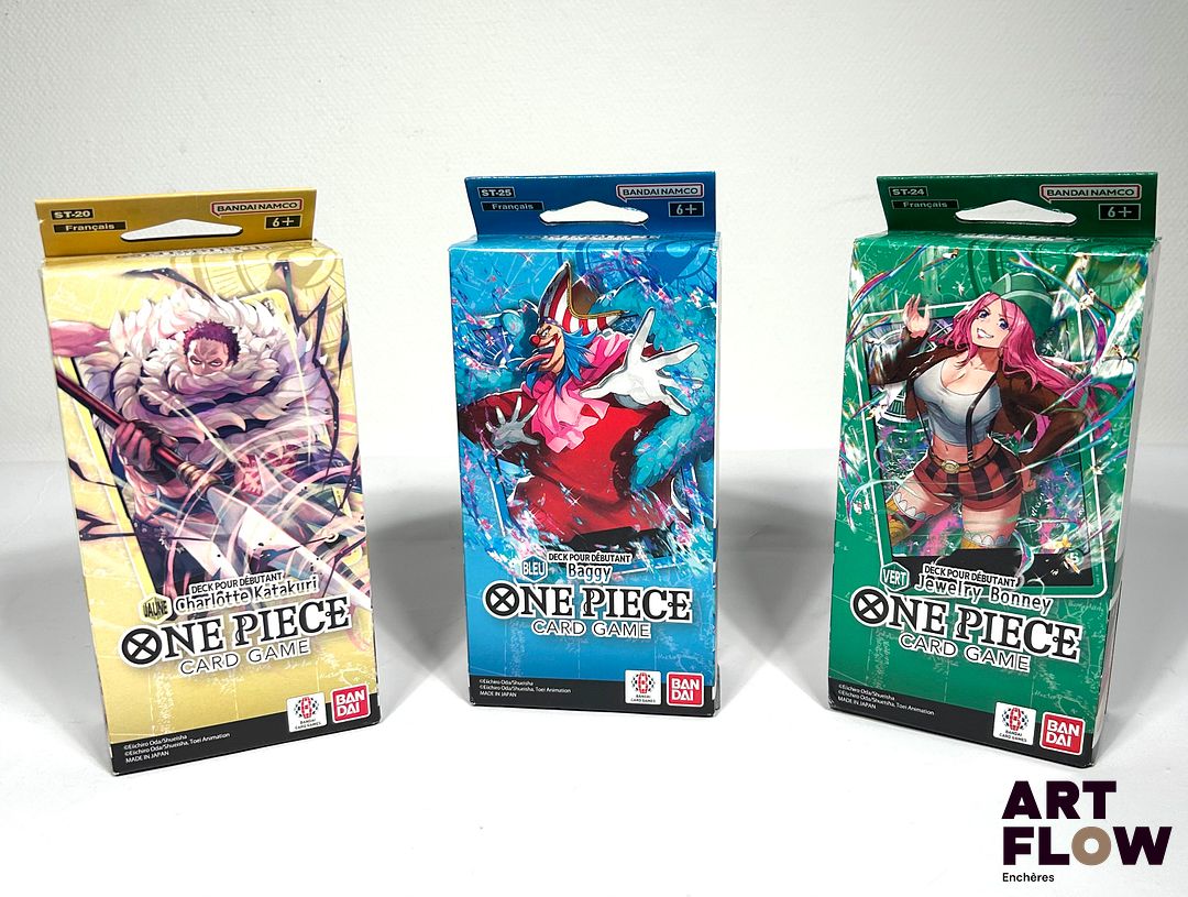 ONE PIECE Ensemble de 9 decks pour débutant : – Deck pour débutant Charlotte Katakuri ST-20 neuf scellé – Deck pour débutant Ace et Newgate ST-22 neuf scellé – Deck pour débutant Edward Newgate ST-15 neuf scellé – Deck pour débutant Smoker ST-19 neuf scellé – Deck pour débutant Baggy ST-25 neuf scellé – Deck pour débutant Jewelry Bonney ST-24 neuf scellé – Deck pour débutant Doflamingo ST-17 neuf scellé – 2 Decks pour débutant Egg Head ST-29 neuf scellé En Francais