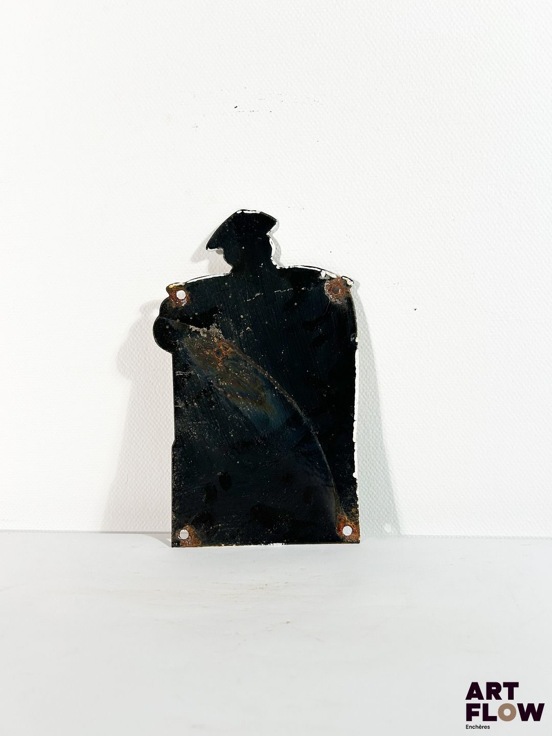 Plaque émaillée d’après Michelin – bonhomme Michelin portant des échasses Dimensions : 22 x 12 cm Petits éclats et traces de rouille – moderne