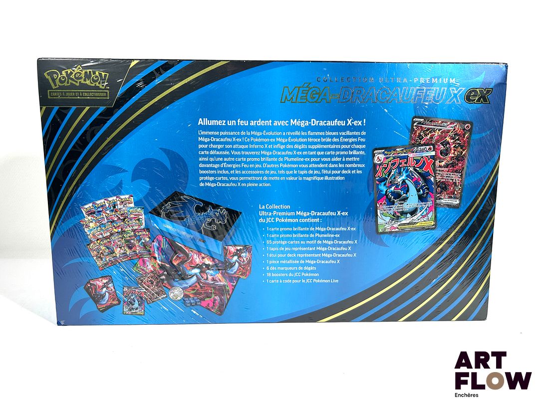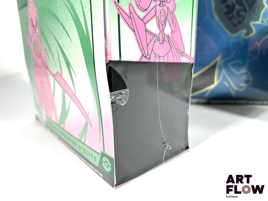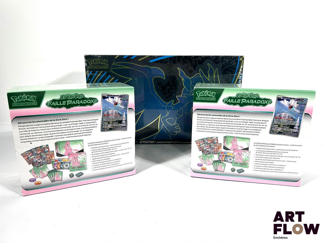 POKEMON Un ensemble comprenant : – 2 coffrets dresseur d’élite ETB Pokemon faille Paradoxe ev4 (scellés, 1/2 scellage endommagé) – Un coffret collection ultra-premium Méga Dracaufeu x EX (scellé, quelques défauts de scellage)