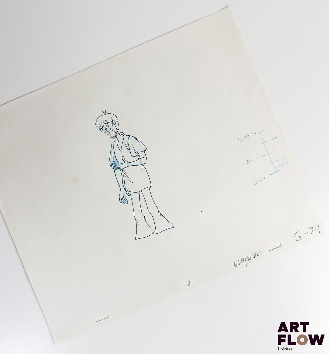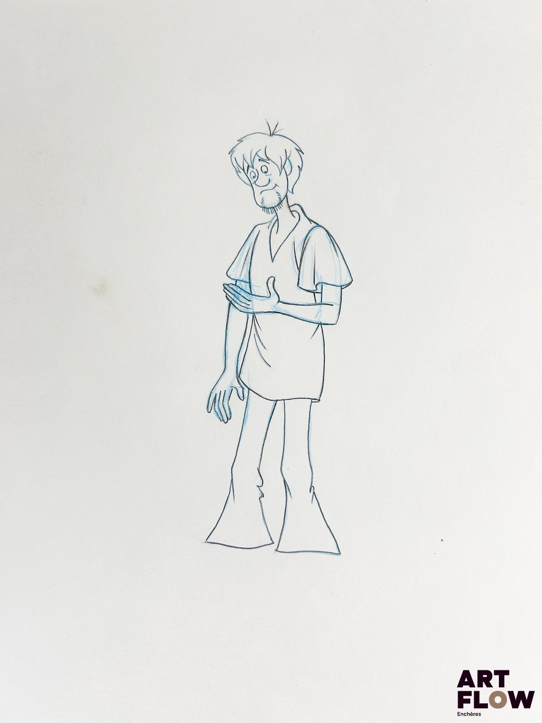 Scooby-Doo d’après Iwao Takamoto Sammy Dessin à la mine de plomb et crayon de couleur représentant Shaggy regardant sa main Animé américain d’après la série Scooby-Doo, Where Are You! créée par Joe Ruby et Ken Spears « Scooby-Doo est le personnage principal de l’univers de Scooby-Doo. C’est un grand chien parlant, gourmand et peureux, mais toujours fidèle à ses amis. Aux côtés de Shaggy, Velma, Daphne et Fred, Scooby-Doo résout des mystères impliquant des monstres et criminels déguisés, mêlant humour, courage et esprit d’équipe dans chaque aventure. » Dimensions : 26,5 x 31,5 cm