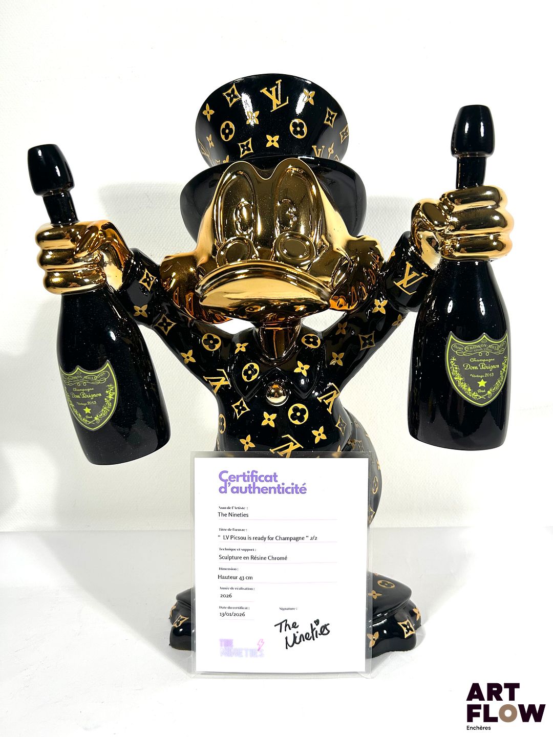 The Nineties « LV Picsou is ready for Champagne » Sculpture Pop Art en résine chromée. Edition limitée, numérotée 2/2, signée, avec certificat d’authenticité. Dimensions : 43 x 29 cm
