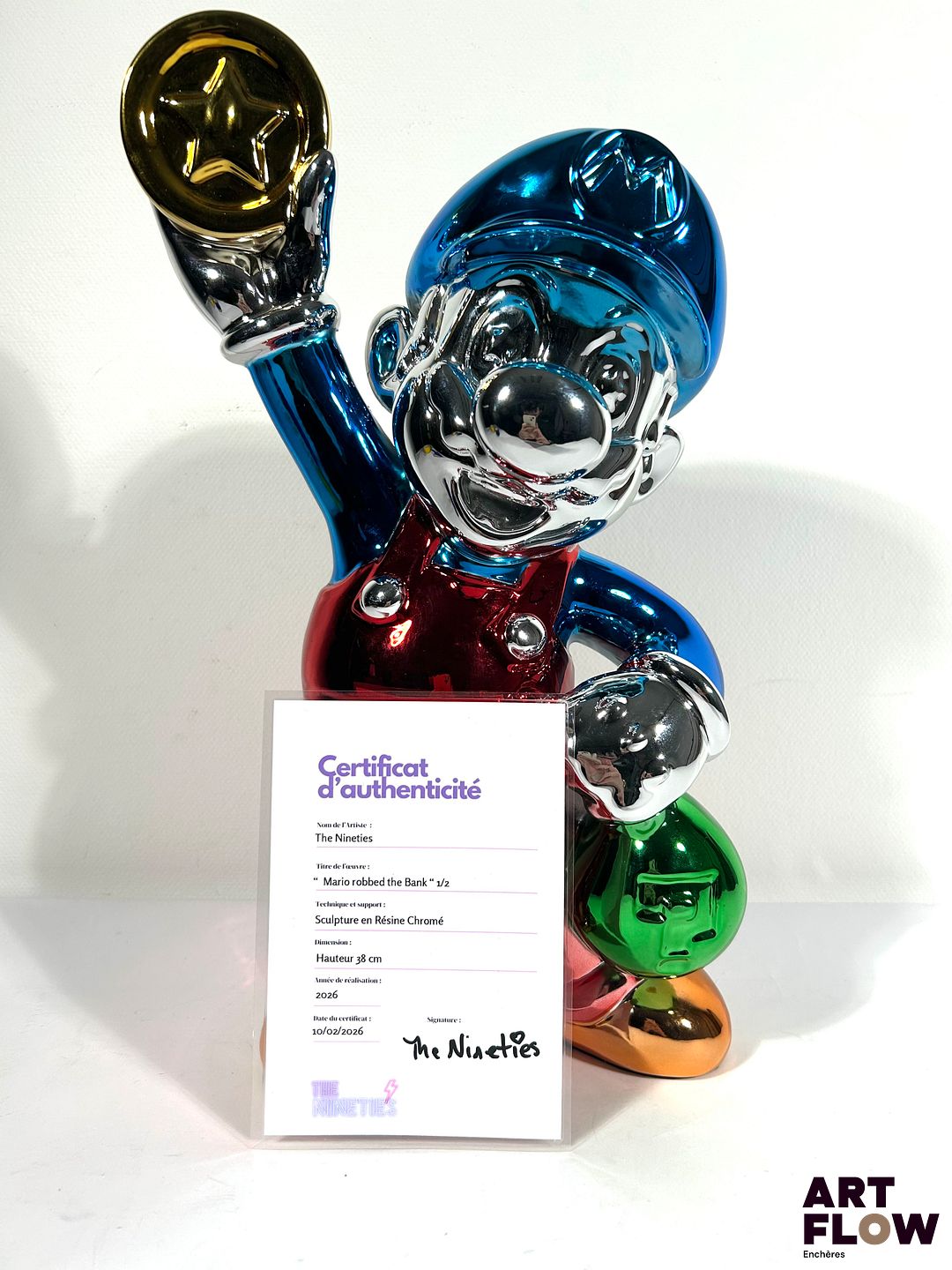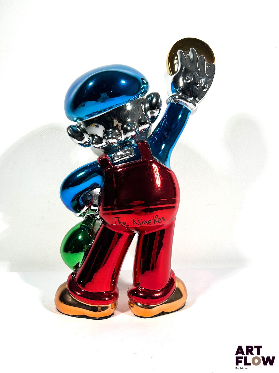 The Nineties « Mario robbed the bank » Sculpture Pop Art en résine chromée. Edition limitée, numérotée 1/2, signée, avec certificat d’authenticité. Dimensions : 38 x 18 cm
